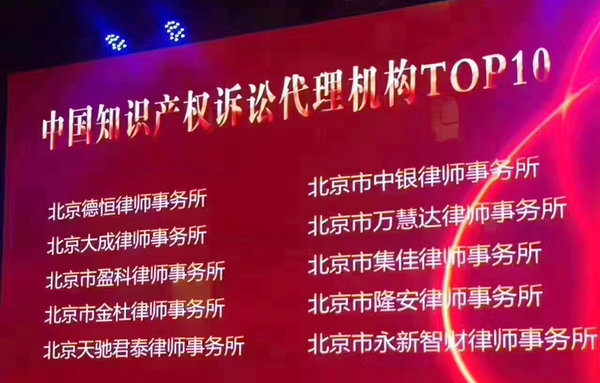 荣登2016年度中国十佳知识产权诉讼代理机构排行榜
